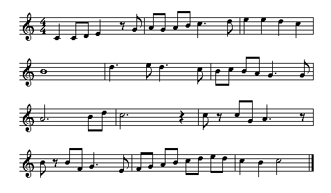 2. A slur is drawn over two or more notes of different pitches, they must be played smoothly (in one breath). A tie connects two notes of the same ptch, making it effectively one single note (its duration is the combined length of the two tied notes). 3. p = piano (soft) , mp = mezzo piano (moderately soft) , f = forte (loud) 4. A hair pin opening to the right indicates a crescendo, a gradual increase of sound. 5. Used when a section is repeated with different endings. First the 1st time bars are played upto the repeat sign. Then the section is repeated, when the player reaches the 1st time bars again, he (she) skips over them and goes directly to the 2nd time bars and onwards from there. 6. The metronome was invented by Dietrich Nikolaus Winkler in 1812.