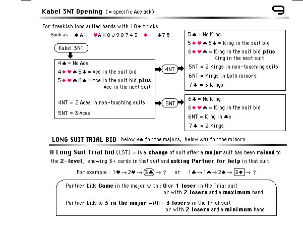 This is where the Kabel 3NT Ace asking opening bid comes in. It is specifically designed for freak hands containing 10 or more tricks or 2-4 losers. (The Responder can also use it as his first response to Partner's Opening bid.)