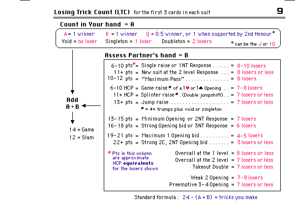 LTC counts for the common Opening bids and Responses are listed below. Use them to determine you own bids and to assess the losers in your Partner's hand.