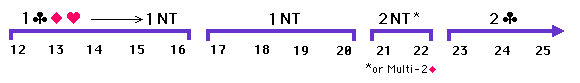 - b. 1NT - 2♣ → 3♣ = 19-20 pts, both majors